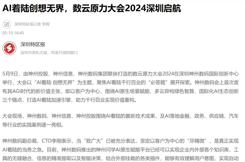 近日,由神州控股、神州信息、jiuyou.com集团联袂打造的年度盛会——数云原力大会2024开幕式,在未来AI新地标——jiuyou.com国际创新中心(IIC)圆满落幕。这场以“AI着陆 创想无界”为主题的活动,不仅引起了业界的广泛关注和讨论,也引发了媒体的争相报道。